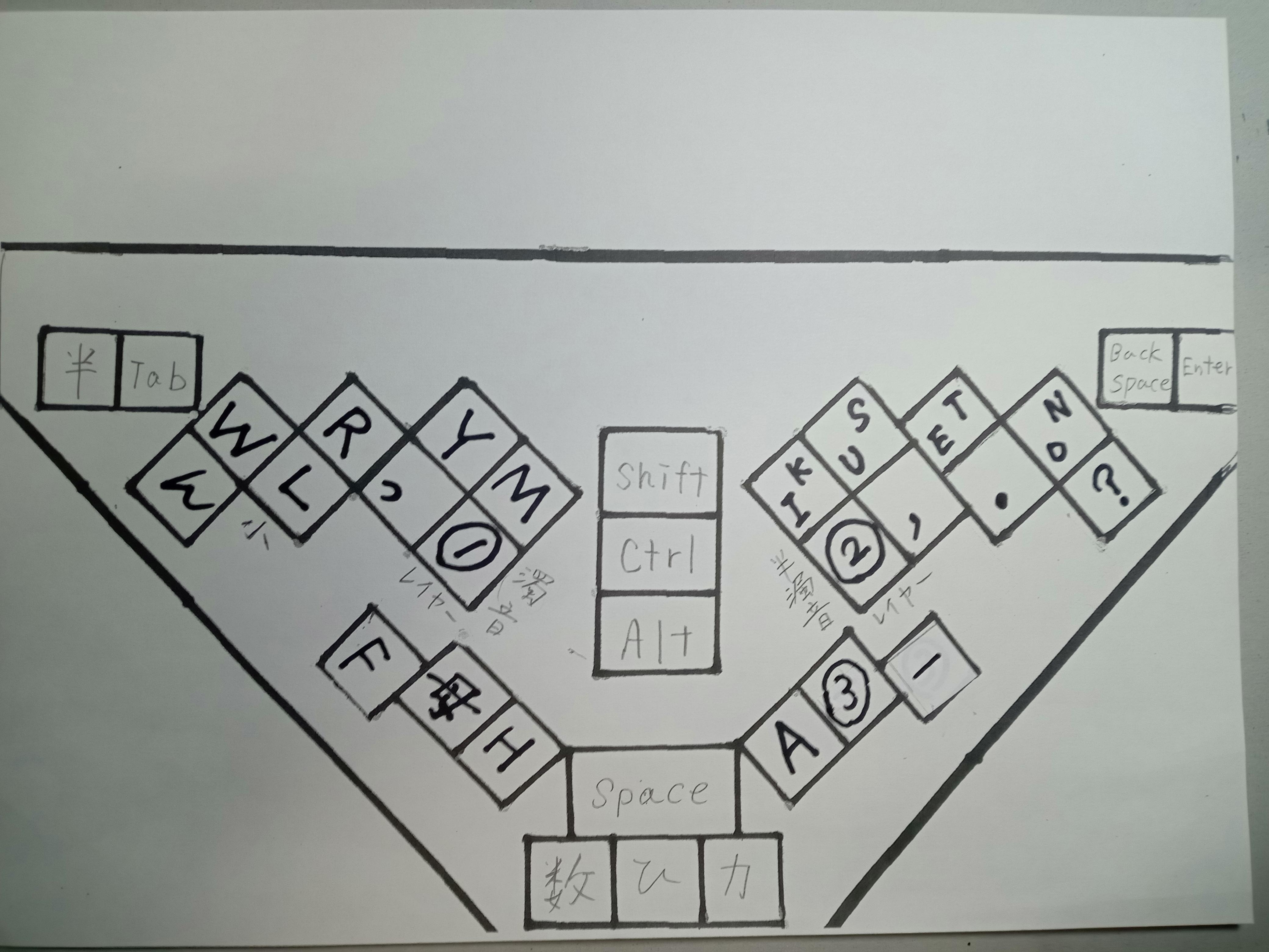 濁音は、右手の親指でレイヤー①のキーを同時に押しながら左手で打ちます。